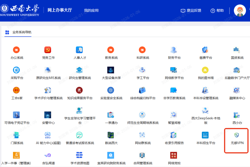 1.登录办事大厅(https://i.swu.edu.cn),在“业务系统导航”栏,点击“无感VPN”。