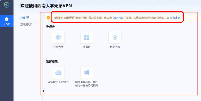 登录无感VPN后,VPN提示界面上图标是灰的,且反复提示“检测到有应用需要依赖客户端才能正常使用,建议您立即下载...”