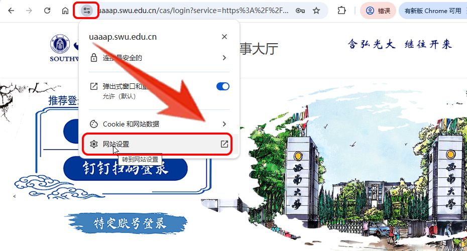 1、打开chrome浏览器,点地址栏左侧的配置按钮,再点 “网站设置 ”。