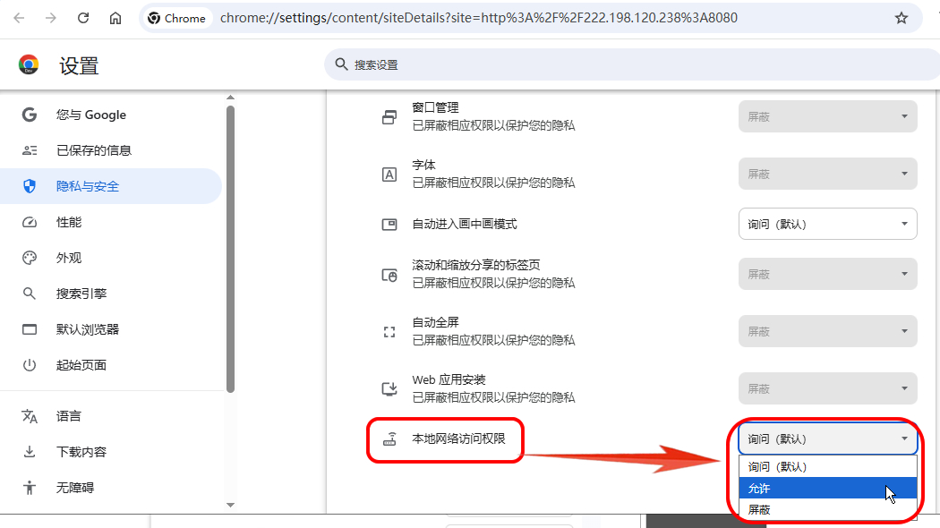 2、下拉到最后,可看到“本地网络访问权限”项,将它后面选项改成“允许”。
