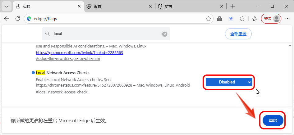 3、将“Local Network Access Checks”选项由"Default”改成“Disable”。